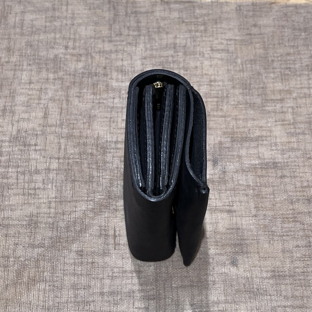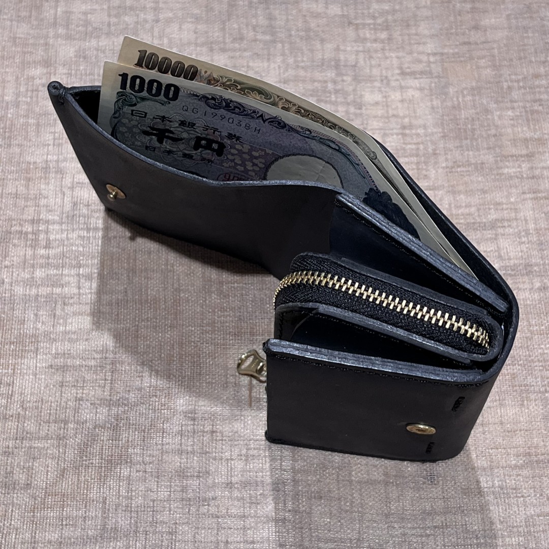 BORSACASAクラシックモデルの中で個人的におすすめのミニ財布をご紹介。革は定番のオイルドバフレザー。クラシックモデルは重厚感があり、最初は少し革本来の硬さがあるのが特徴ですが、こちらのミニ財布はデザインや一部手縫いを施すことでしなやかさがあります。新品の内から硬さを気にせずお使いいただけて、小銭やカードが多くても形が崩れにくいのでおすすめです。形が崩れないと言っても、経年変化によって自分好みの形や柔らかさには変わっていくので大事に育てていただければ幸いです。