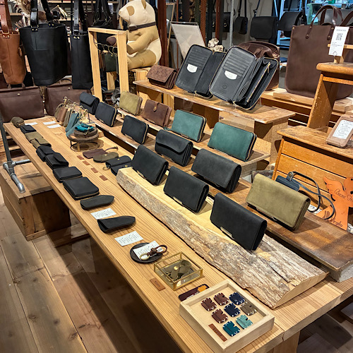 奥に進んだところにあるテーブルとなります。こちらはミニサイズからミドルサイズまでのコンパクトな財布類、小銭入れ類になります。