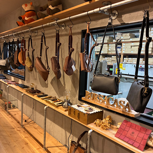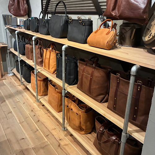 反対側の壁面にはショルダーバッグが多数並んでおります。またガラスの奥には実際に作業をしている工房があります。工房1階スペースは私がブログによく投稿をしている裁断をしている場所になります。是非覗いてみてください!