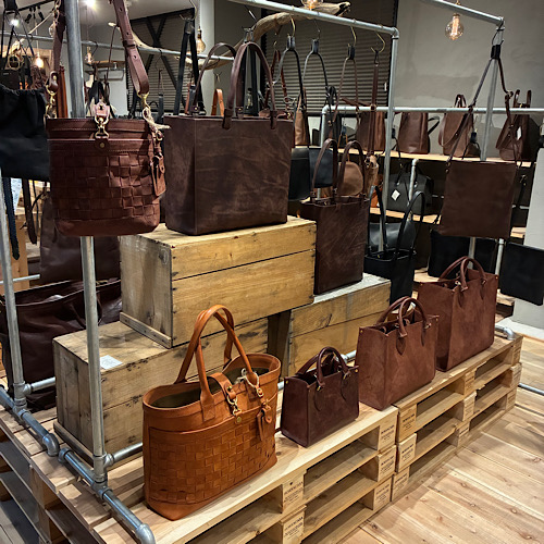 続けて店舗壁面に並んでいます、トートバッグ類です。ハンドバッグになる小さなサイズからご旅行でも使える大きなサイズまで、多種類のご用意がございます。