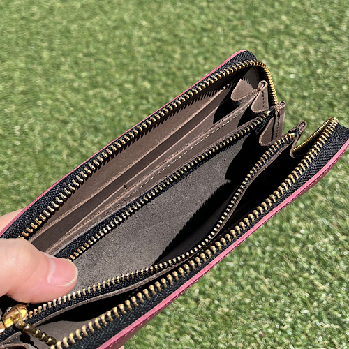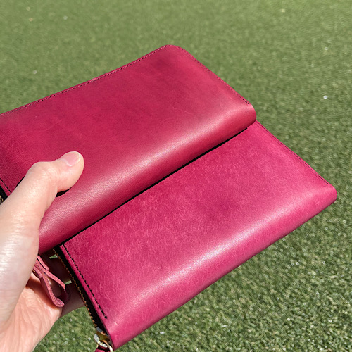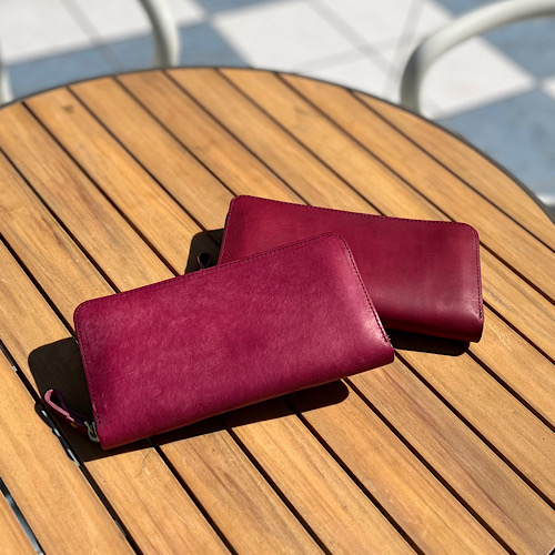 こちら『ラウンド長財布(W-1001)』をベースとし限定カラーで製作させていただきました。お花のような鮮やかな雰囲気の色味となっており存在感のあるアイテムに仕上がりました。