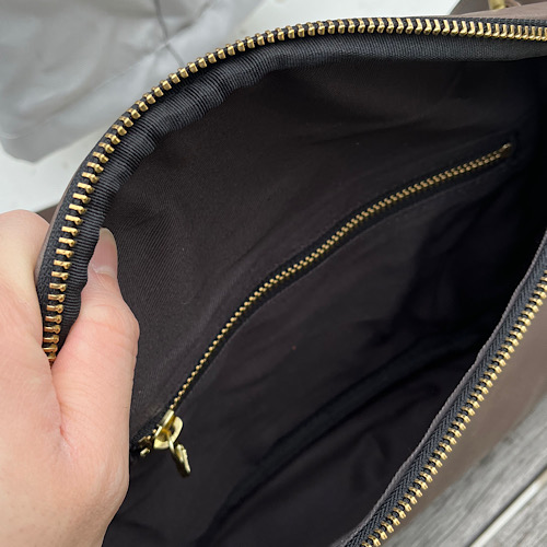 正面からはシンプルに革の良さを引き立たさせるため装飾はあえて見せずに。バッグ内装や本体背面部分にはそれぞれ収納を配置しております。フリーポケットやファスナーポケット、ホックポケットなど用途、収納物に応じて様々な方法で活用いただくことが出来ます。