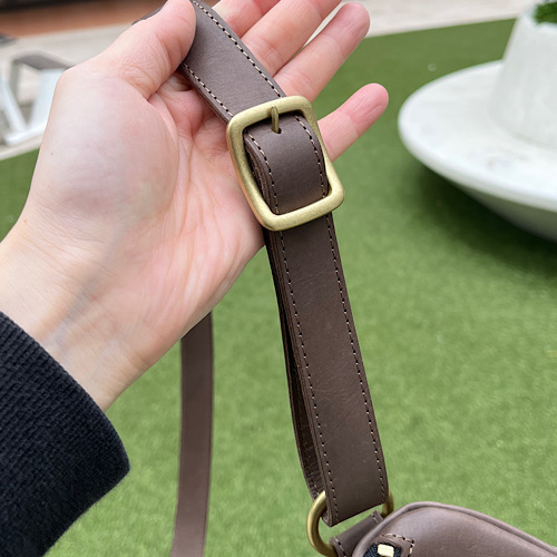 本体背面部金具を固定するパーツやショルダー紐等の負荷がかかりやすいパーツには革2枚を張り合わせステッチをかける贅沢な仕様とすることで強度と革の伸びが少ないように工夫して製作しております。