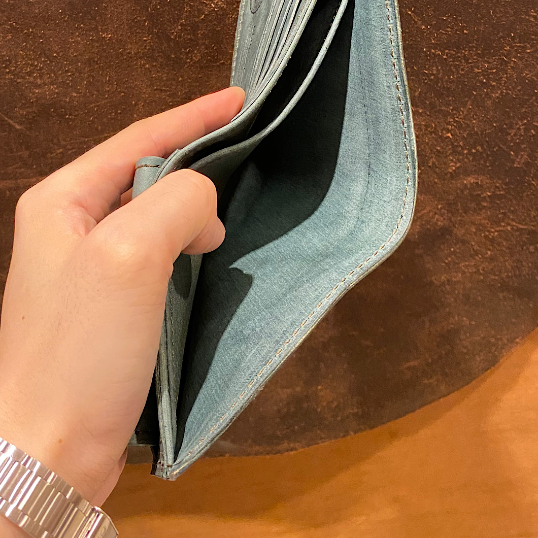 札入れ部分は本体にL字のステッチで縫うことで右側を留めていない仕様に。クリアファイルのように大きく開閉が行えることでお札や領収書の出し入れが簡単に行うことが出来ます。