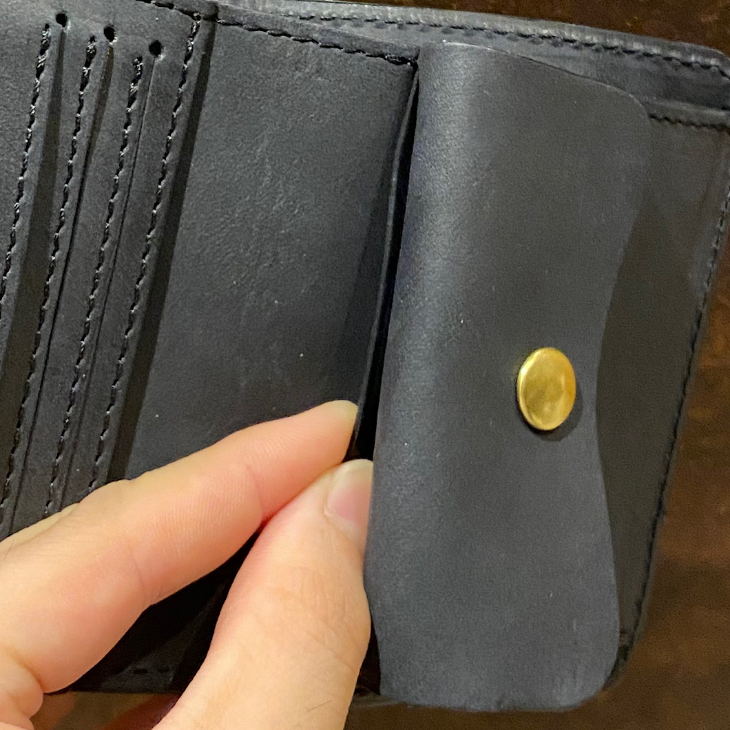 留め具部分を左側に中央にカード入れ、右側に小銭入れが配置しております。