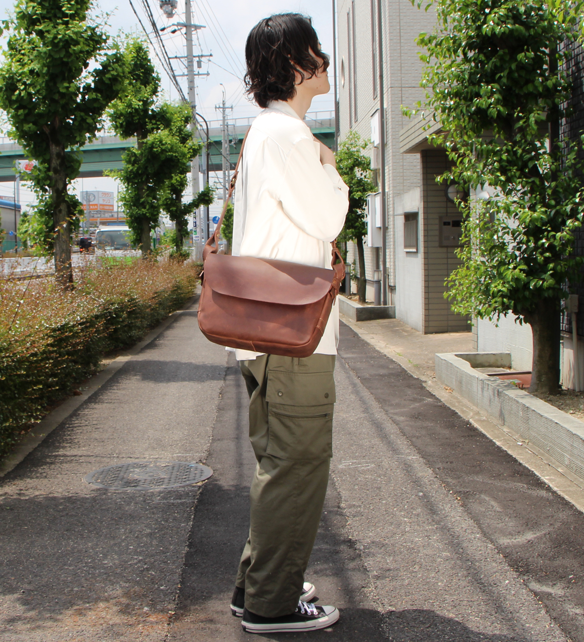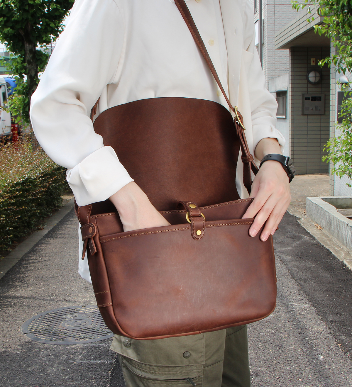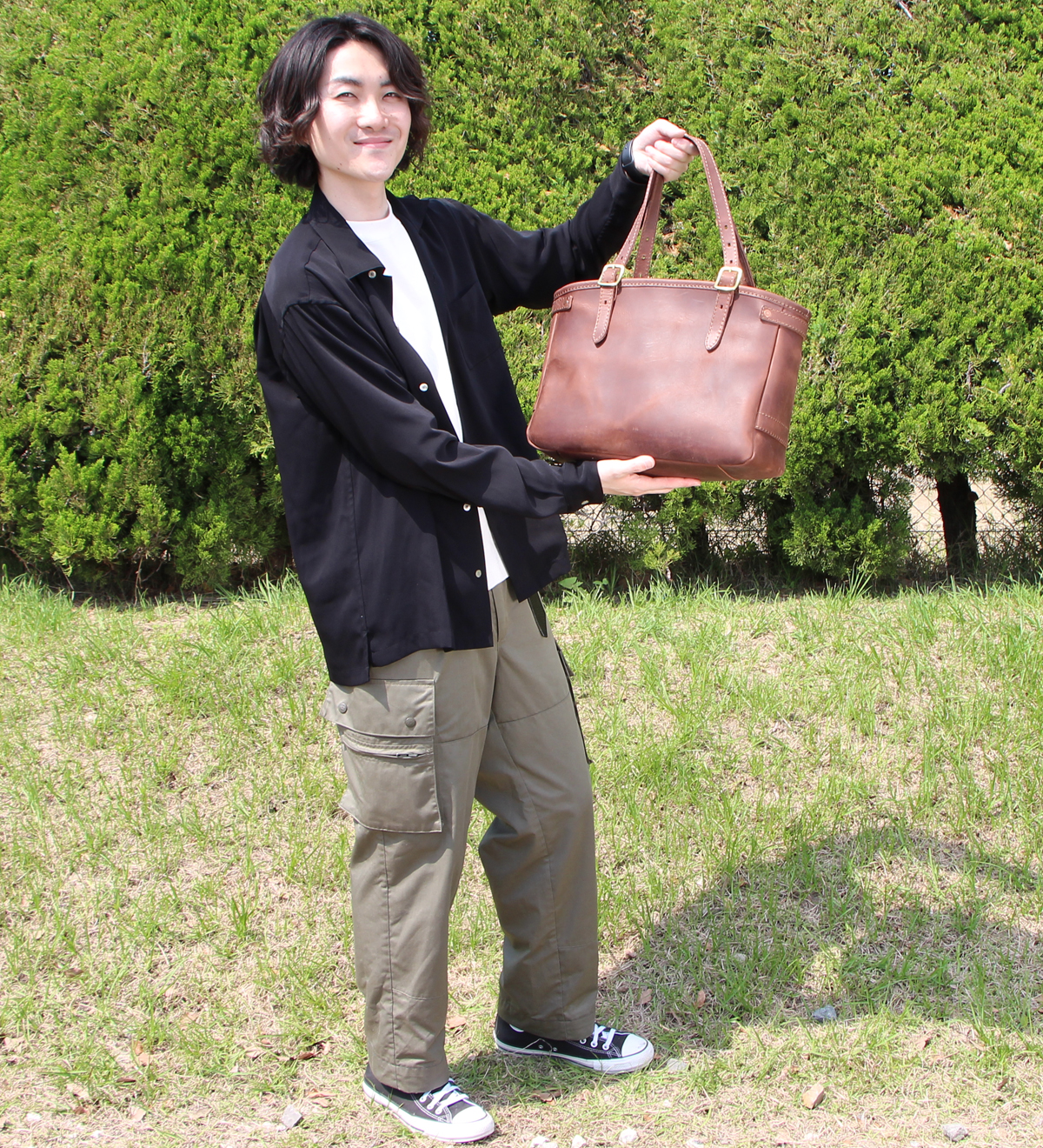使い勝手の良さを追求し、細部までこだわりをぎゅっと詰め込んだトートバッグ。取り外しが可能なショルダー紐付きで、よりデイリーに使いやすくなっています。ころんとしたコンパクトなサイズ感ですが、マチが広いので収納力も抜群。前ポケットにはスマートフォンも収納可能です。銅鋲のアクセントやマチの作りが個性的なデザイン。