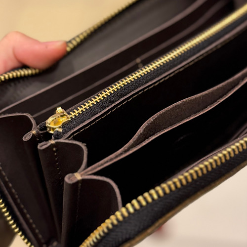 ファスナーの金属の色や内装で使用している革が違ったりなど、1点モノの雰囲気を感じていただける財布となっております。