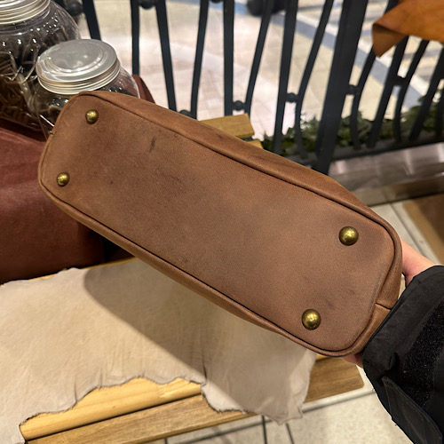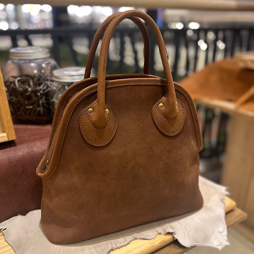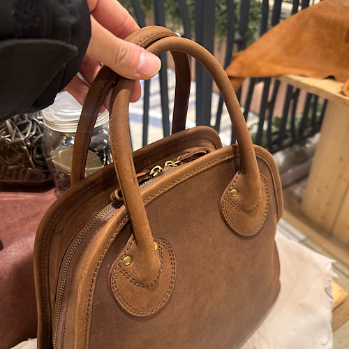 丸みを帯びた箇所とカチッとした箇所が見え、贅沢に革を使用したハンドバッグ、トートバッグとなります。長島店には定番オイルドバフレザーのブラックを使用した1点をご用意しております。