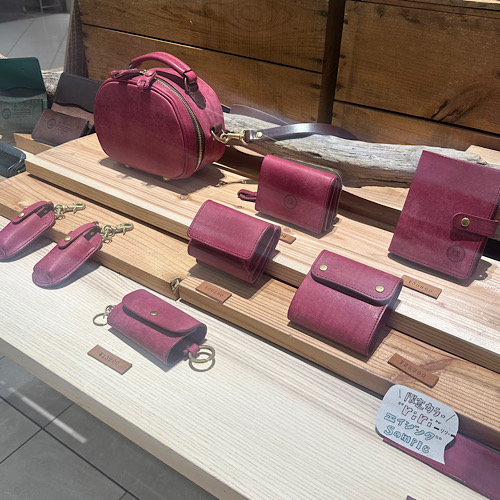 現在長島店、竜王店両施設店舗には限定革を使用したお財布が入荷しております。製作したベースのアイテムは好評いただいております2型。ラウンド長財布(W-1001)・二つ折り横(W-1004)に厳選し製作させていただきました。