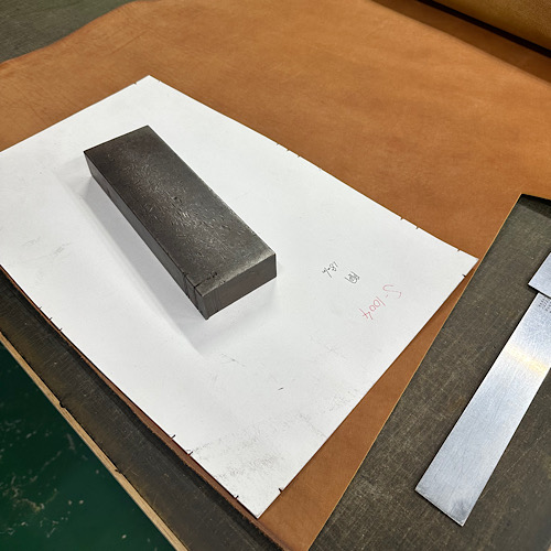 この日は主にバッグ類の裁断を行いました。革包丁を使い、型紙を革に合わせ丁寧に切っていきます。