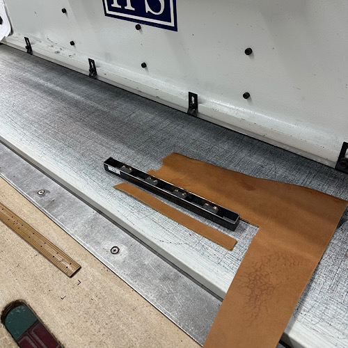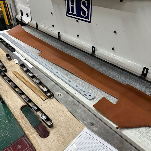 今回の革は画像に写っています大きな裁断機からもはみ出してしまう程の大きさでした。