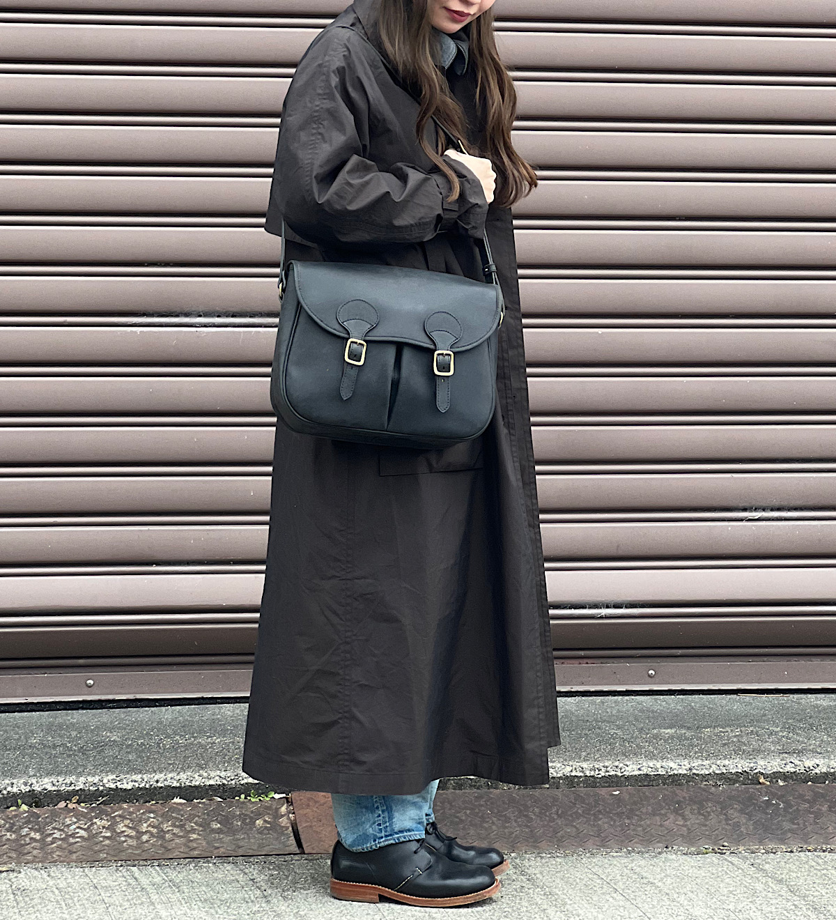 クラシカルな雰囲気のショルダーバッグは、フロントの美錠が映えるデザインです。ロングコートにさらっと合わせるのもおすすめです。アウターに負けない存在感と重厚な見た目が魅力的で、ブラックのカラーは特に真鍮の金具が引き立ち、大人な顔つきです。