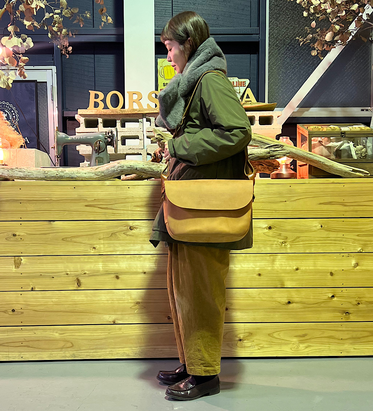 滴る雫のようなふっくらとしたフォルムが可愛らしいショルダーバッグです。背面のポケット部分はファスナーが隠れるようなデザイン。ボディバッグのように斜めかけするのおすすめです。こちらは栃木レザーを使用したカスタムバージョンで、個性的なシボと軽さが特徴のレザーです。本店にてオーダーを承っておりますので、気になった方は是非本店に足をお運びください!