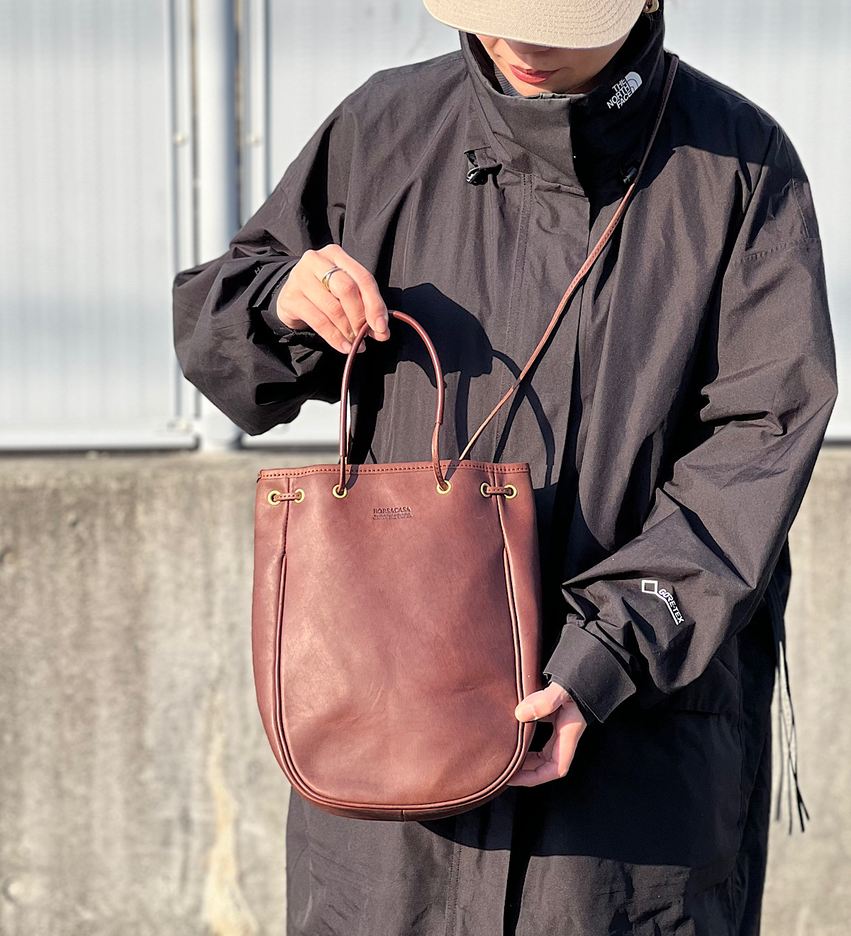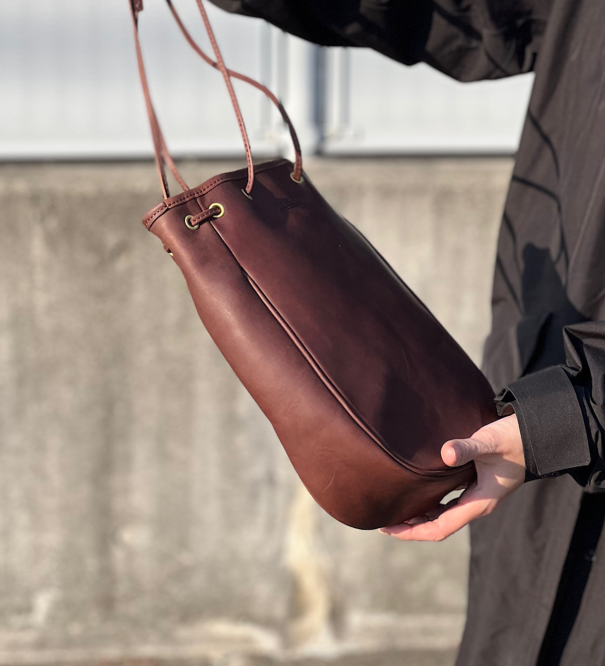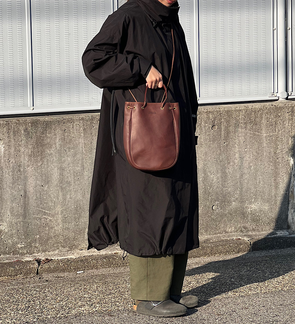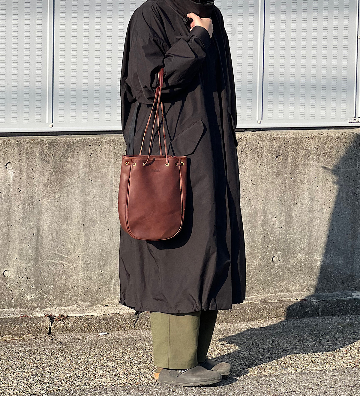コッペパンのようなラインが可愛いらしいショルダーバッグ。紐は細く繊細なお作りで革巻きはヌメ革をポイントに施しています。紐通し用にボディに留めつけたハトメのゴールドがアクセントになっています。コードの長さを調整すれば斜めがけにもなりますので、お洋服やお出掛けのシーンに合わせて印象も変えて持ち歩けます。