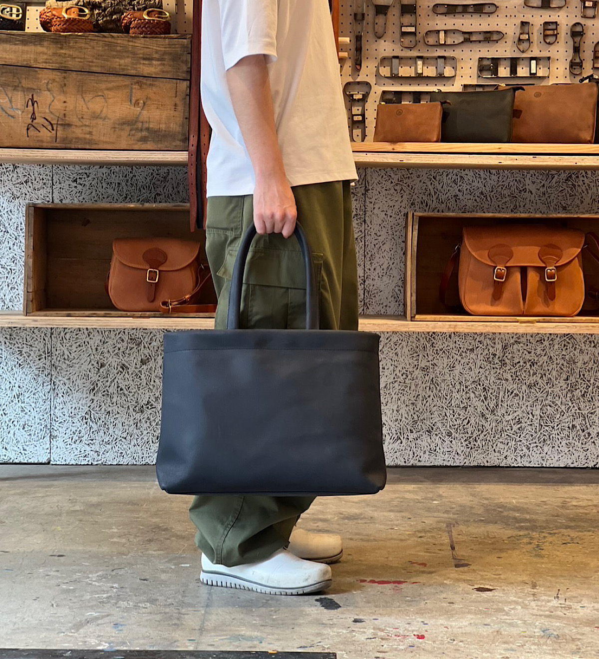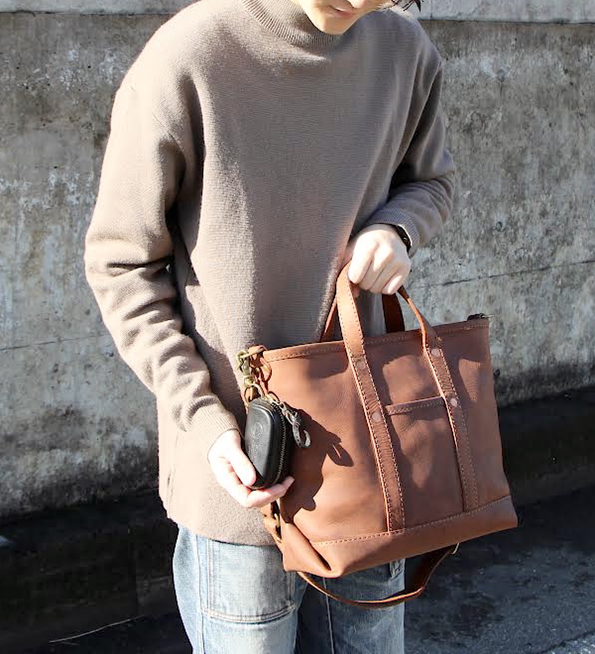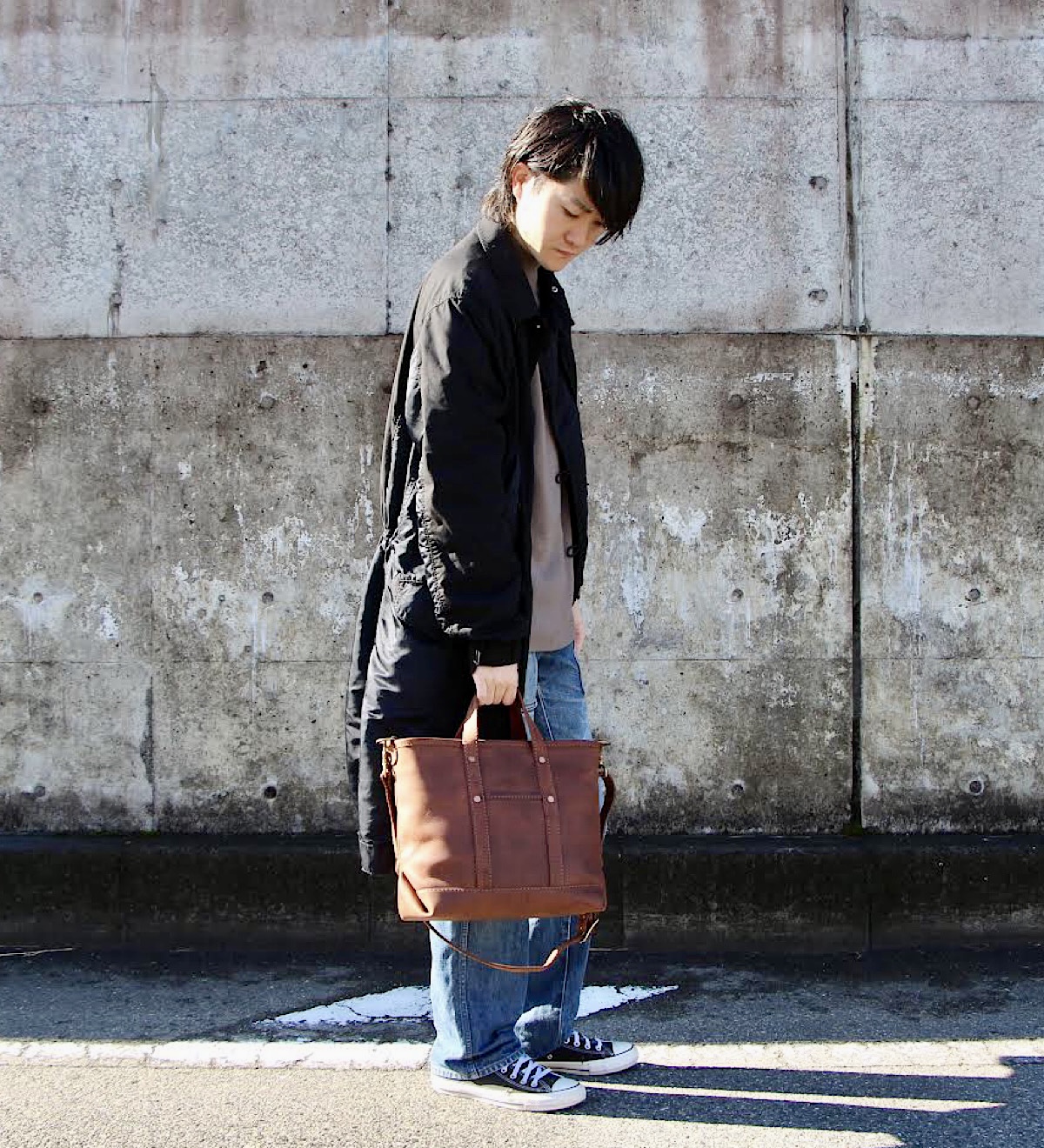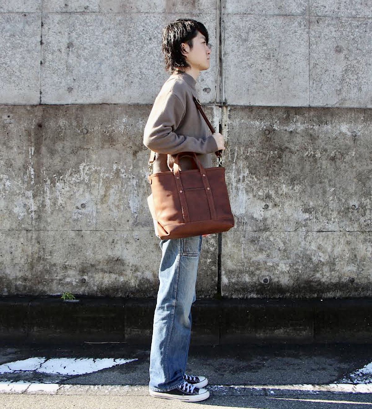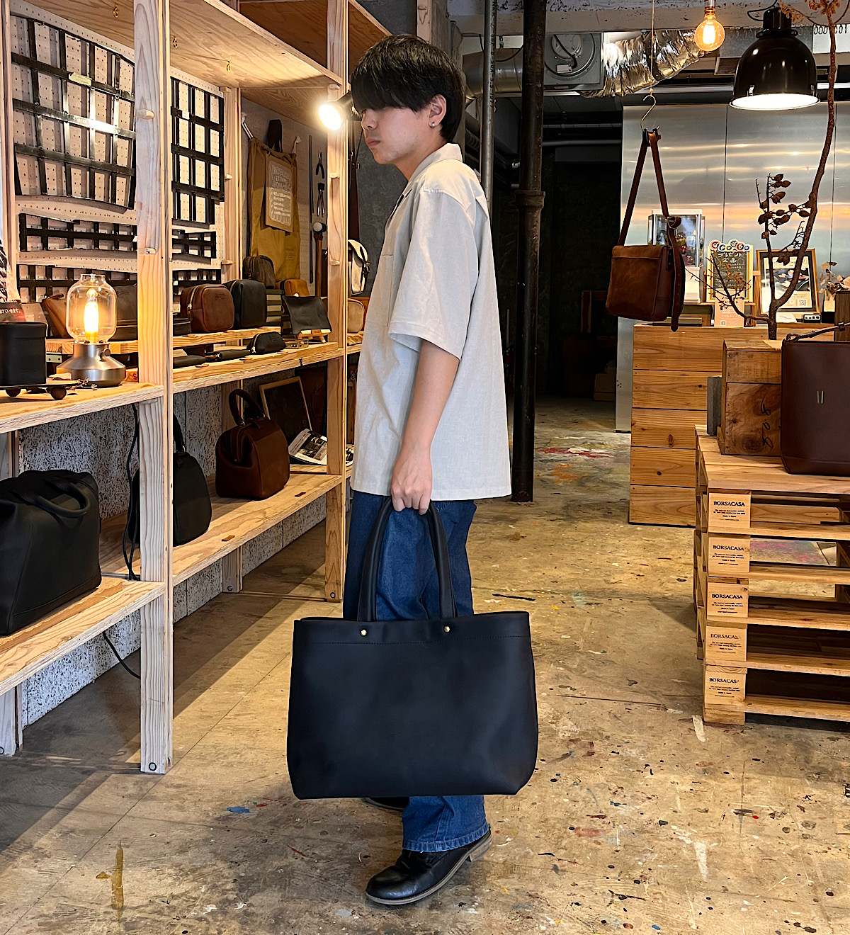 今回は縦型のトートバッグを撮影。靴に合わせてブルチャットを選びました。A4が余裕を持って入るサイズですが、縦型で大きすぎないため普段使いにも学校やお仕事にもちょうど良いスッキリとした印象です。シンプルな見た目ですが、縦帯のヌメ革がアクセントになっています。カジュアルな服装はもちろんスーツやオフィカジにも合うデザインで使い時に困りません。レザーの重厚感とマットな茶色の優しい印象が相まってとても落ち着いた仕上がりのトートバッグです。