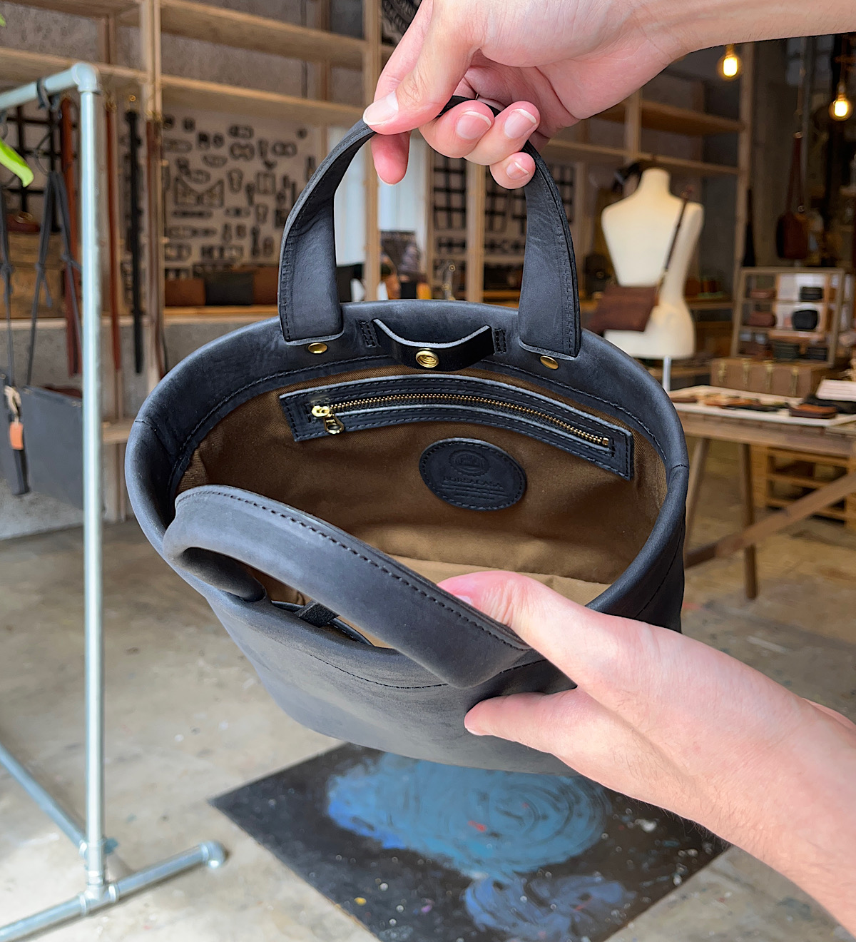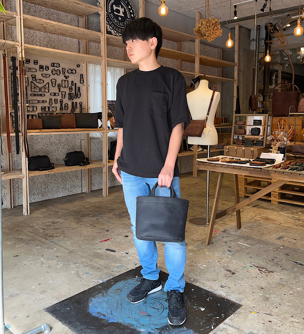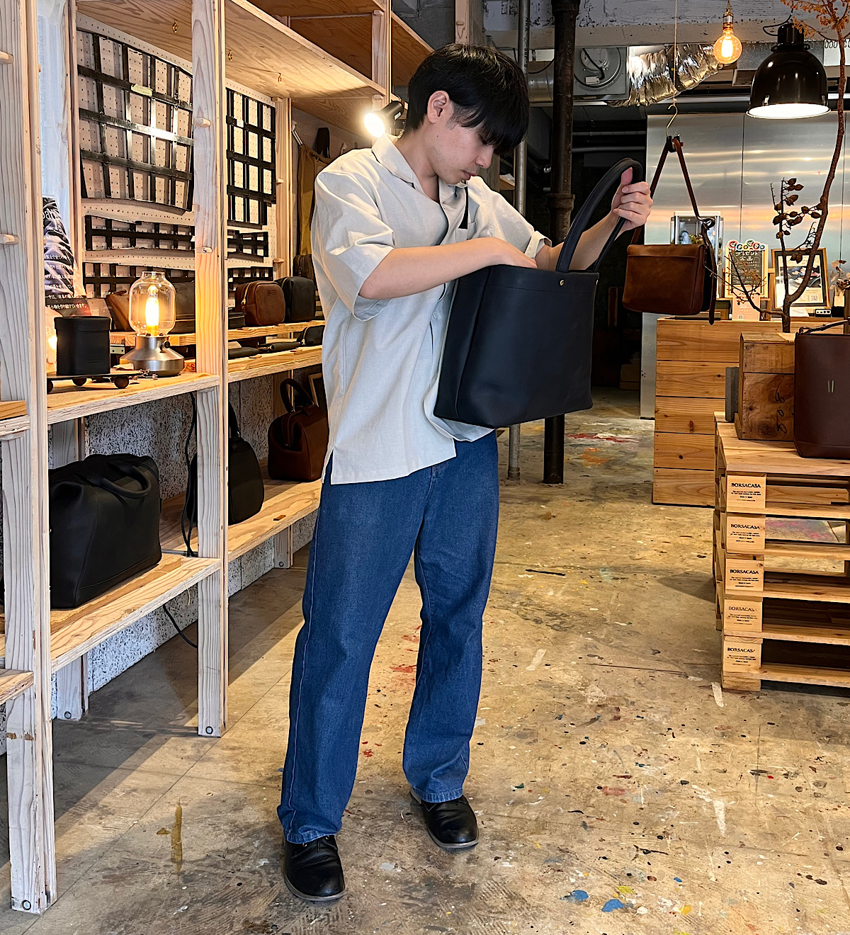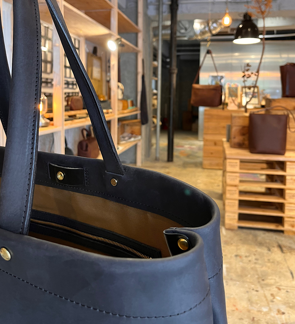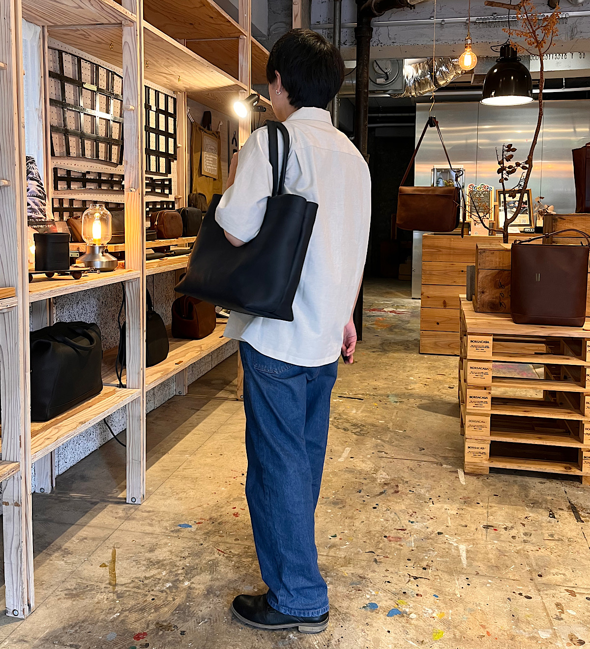 今回は縦型のトートバッグを撮影。靴に合わせてブルチャットを選びました。A4が余裕を持って入るサイズですが、縦型で大きすぎないため普段使いにも学校やお仕事にもちょうど良いスッキリとした印象です。シンプルな見た目ですが、縦帯のヌメ革がアクセントになっています。カジュアルな服装はもちろんスーツやオフィカジにも合うデザインで使い時に困りません。レザーの重厚感とマットな茶色の優しい印象が相まってとても落ち着いた仕上がりのトートバッグです。