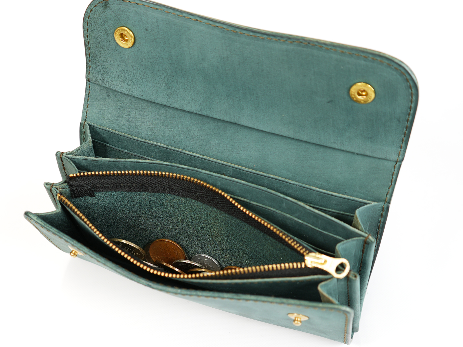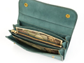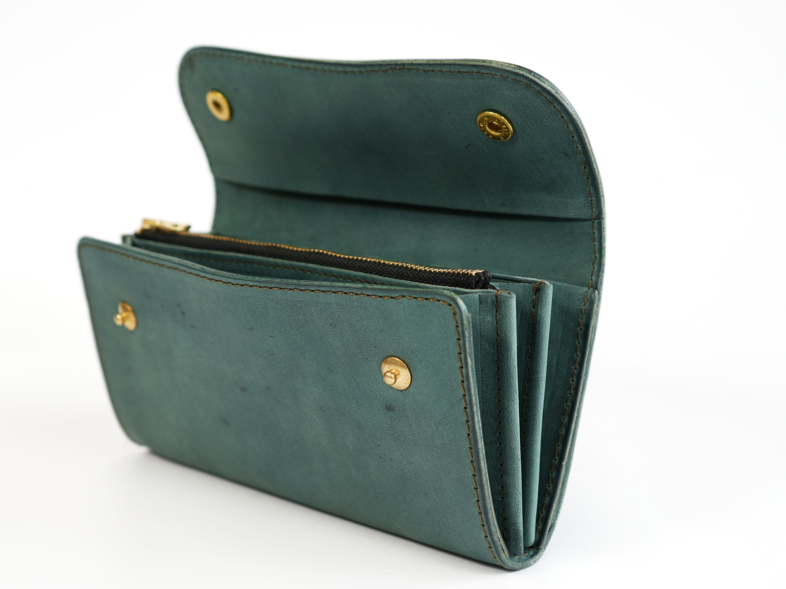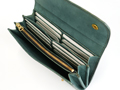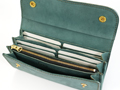 ホック仕様の三つ折り長財布。カード収納は12枚と充実しており、カード入れの他に紙幣などを収納できるスペースが3つ、背面のカード入れの後ろにも収納スペースがあります。小銭入れはファスナータイプで口元を大きく開いて小銭の出し入れをする事が出来ます。ホックにはイタリアPRYM社製のこだわりのものを贅沢に使用し、2つホックでしっかりと留めていただけます。無骨ながら使うほどに味わい深く、使う仕草までも雰囲気を感じる一品です。