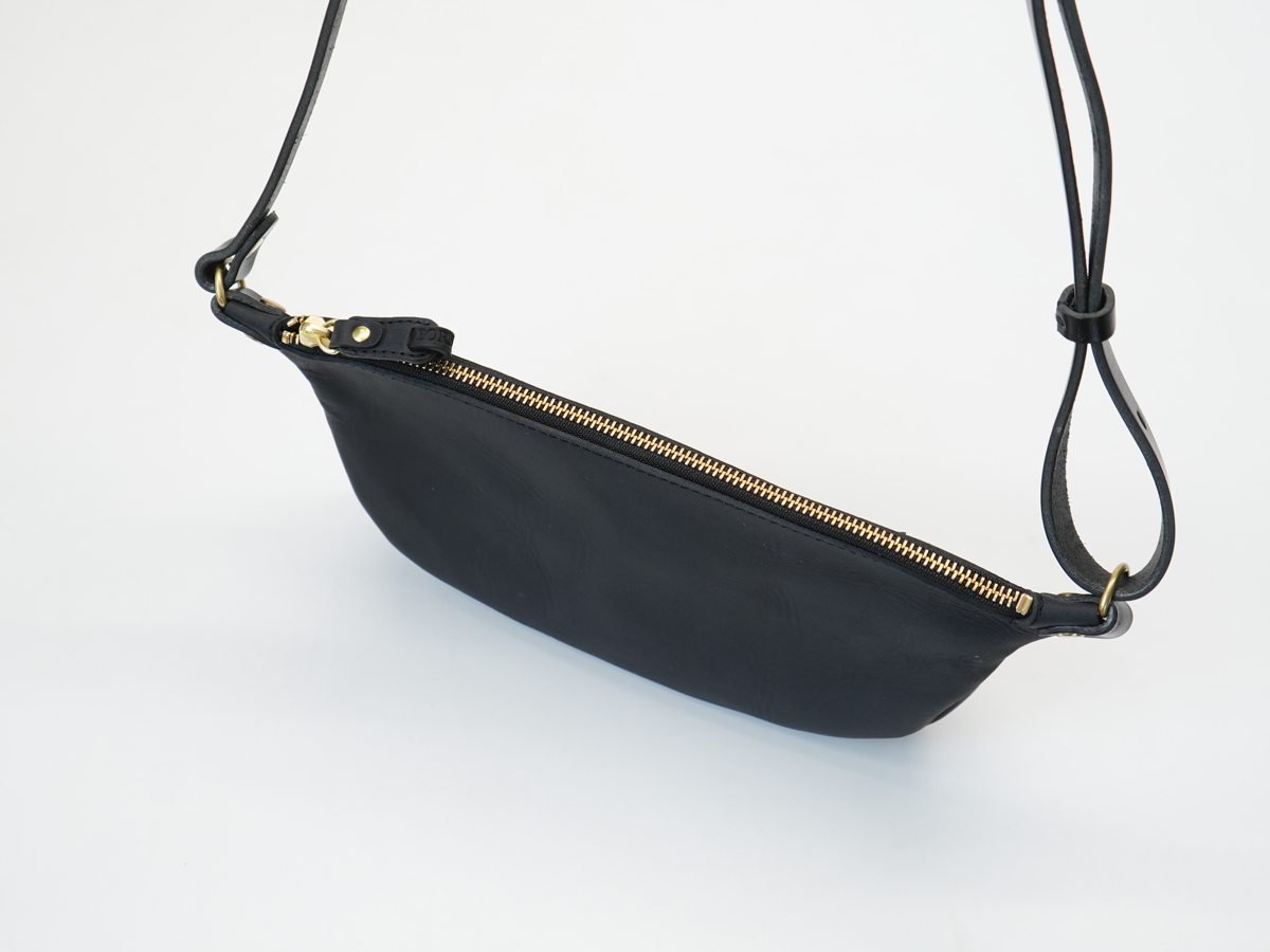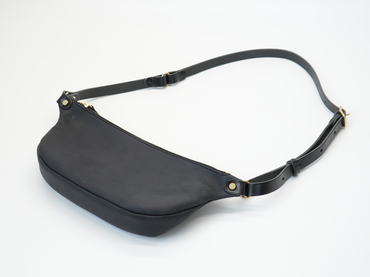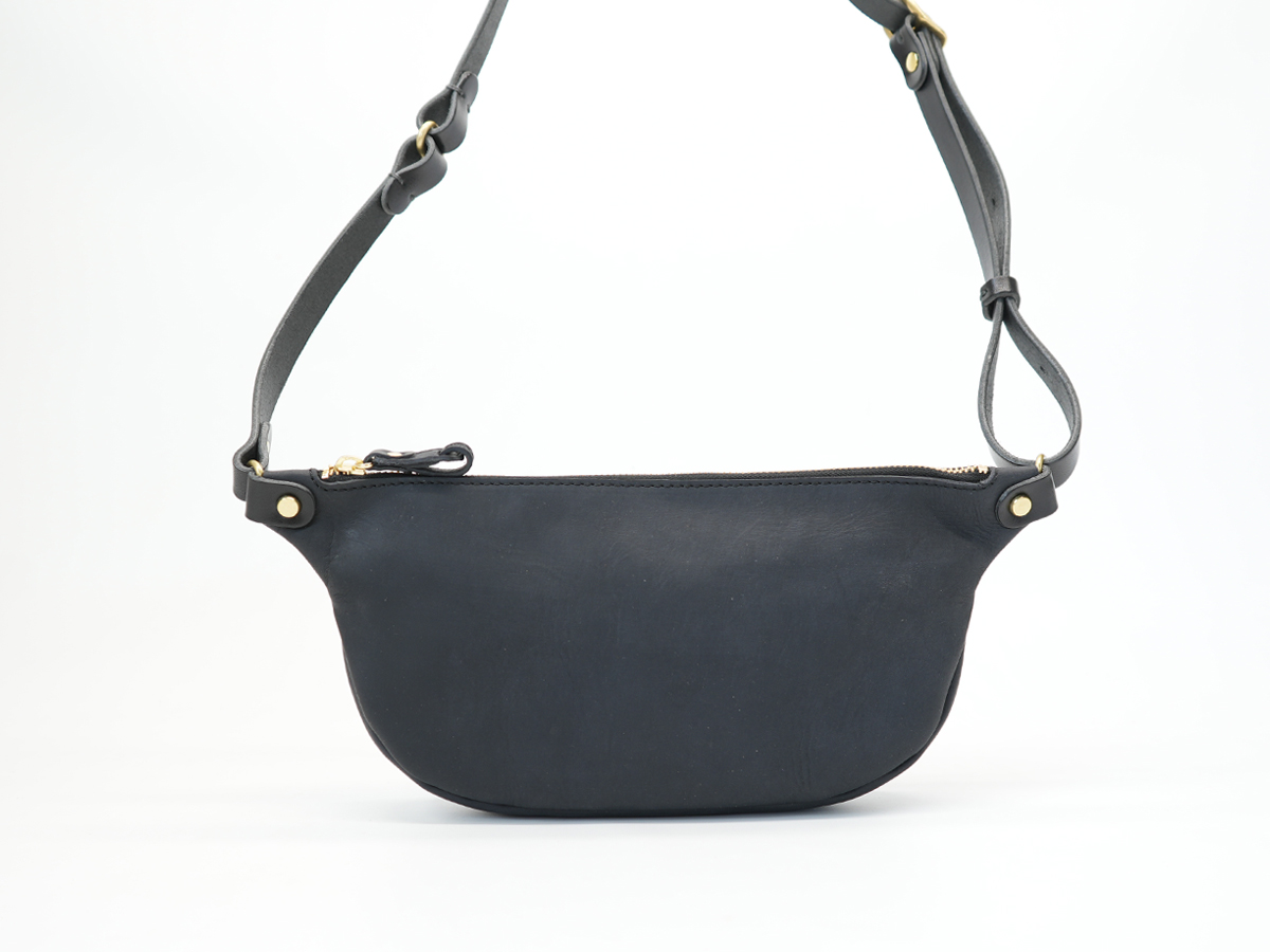 流線型のフォルムのスマートなボディバッグ。薄マチですっきりと持ち運べますので必要最低限のものだけをさくっと入れて、身軽にお出かけできます。体にもぴったりとフィットしますので、自転車にもおすすめです。シンプルなデザインですが、一枚革で前後ろの胴体の継ぎ目がなく贅沢な仕様になっているのが最大のポイントです。また背面にもファスナーポケットがありますので、スマートフォンなどを分けて収納するのに便利です。また内装にはオープンポケットが付属しておりますのでスリムながら区分けができます。お洋服のポケットのように荷物を身に着けられます。手ぶら感覚でお出かけできる相棒のようなお鞄に仕上がりました。