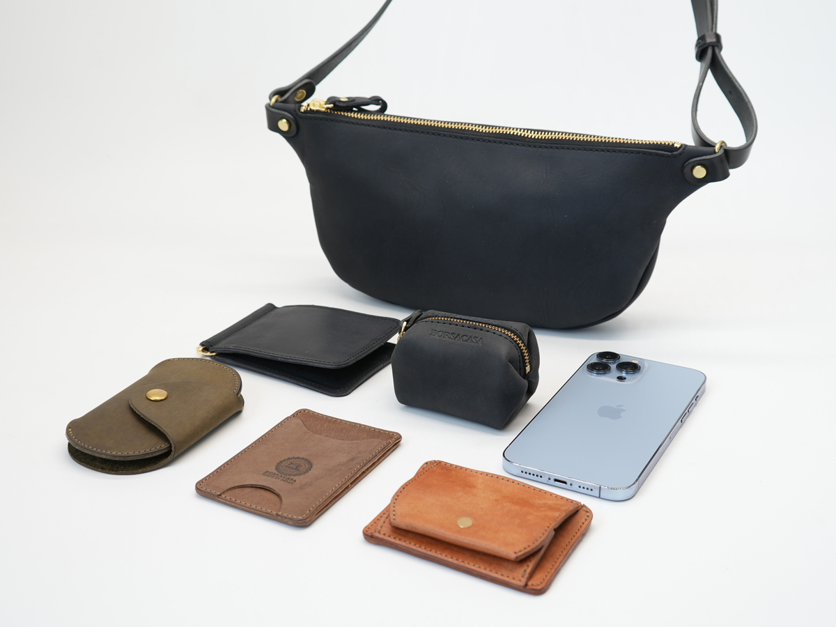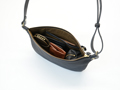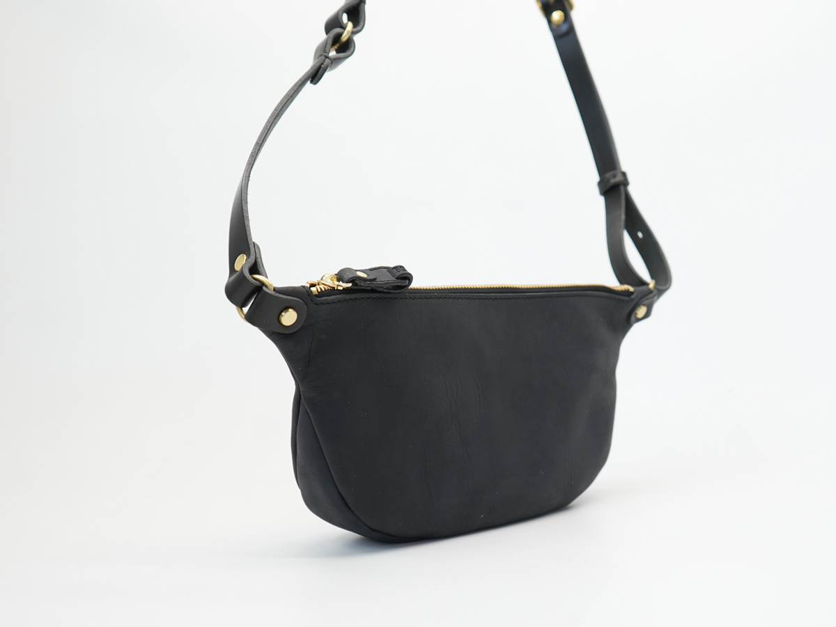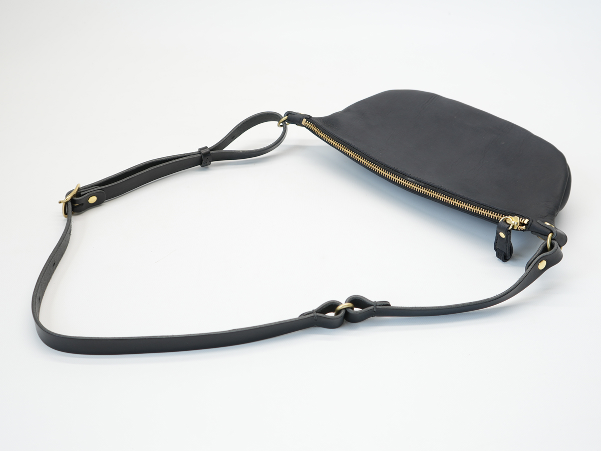 流線型のフォルムのスマートなボディバッグ。薄マチですっきりと持ち運べますので必要最低限のものだけをさくっと入れて、身軽にお出かけできます。体にもぴったりとフィットしますので、自転車にもおすすめです。シンプルなデザインですが、一枚革で前後ろの胴体の継ぎ目がなく贅沢な仕様になっているのが最大のポイントです。また背面にもファスナーポケットがありますので、スマートフォンなどを分けて収納するのに便利です。また内装にはオープンポケットが付属しておりますのでスリムながら区分けができます。お洋服のポケットのように荷物を身に着けられます。手ぶら感覚でお出かけできる相棒のようなお鞄に仕上がりました。