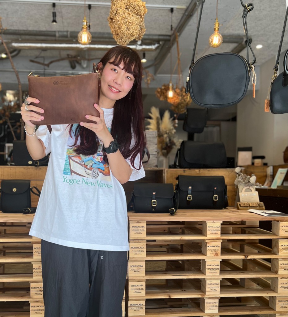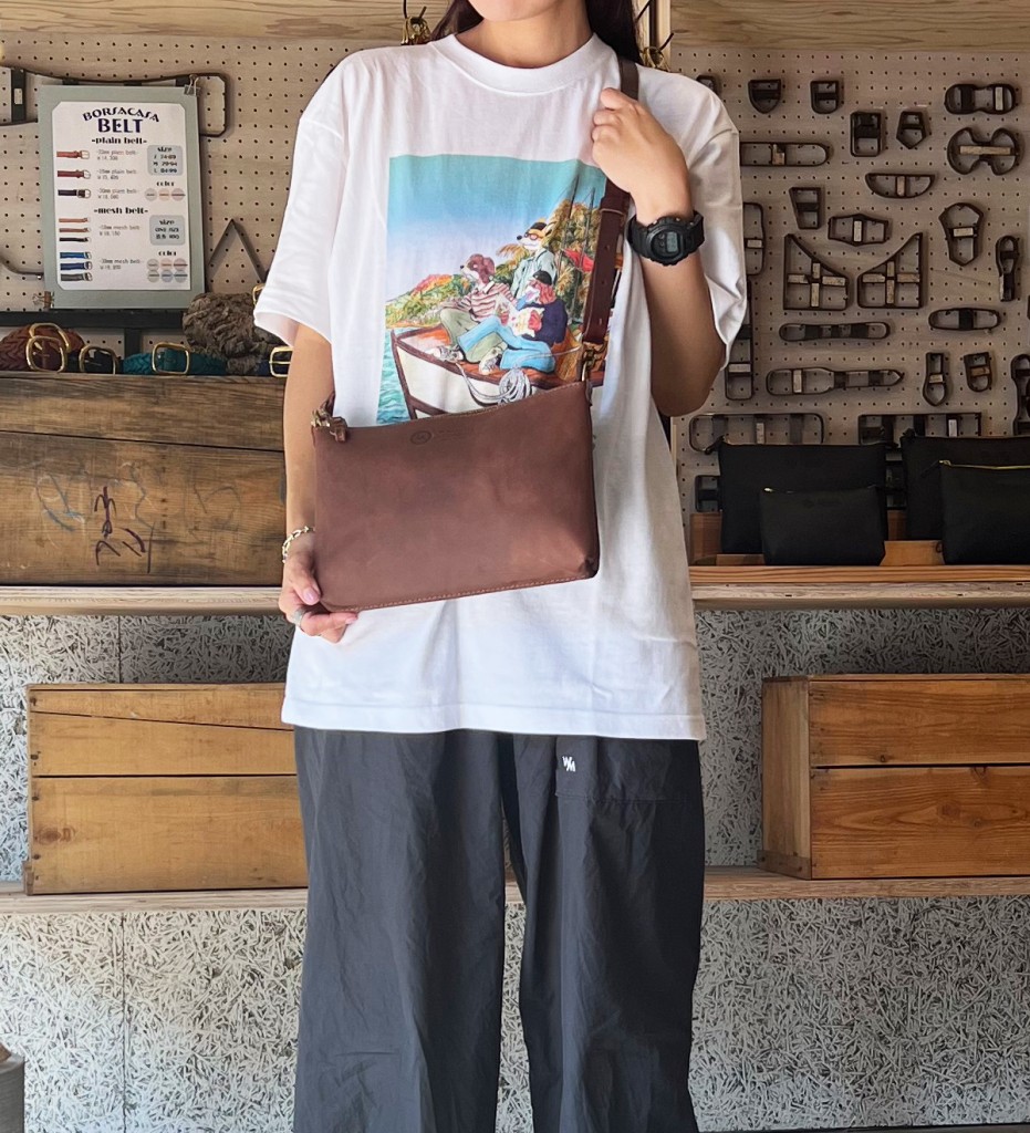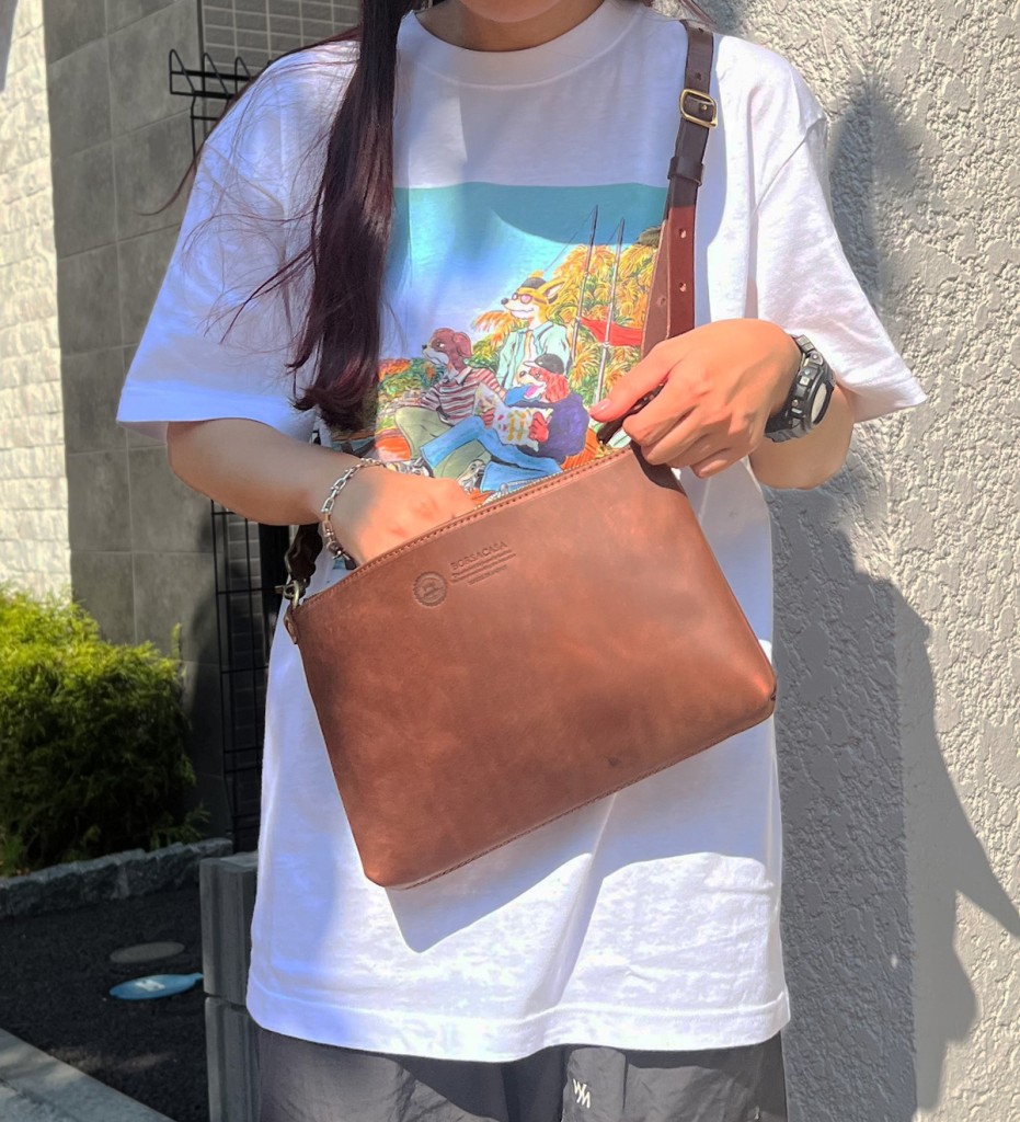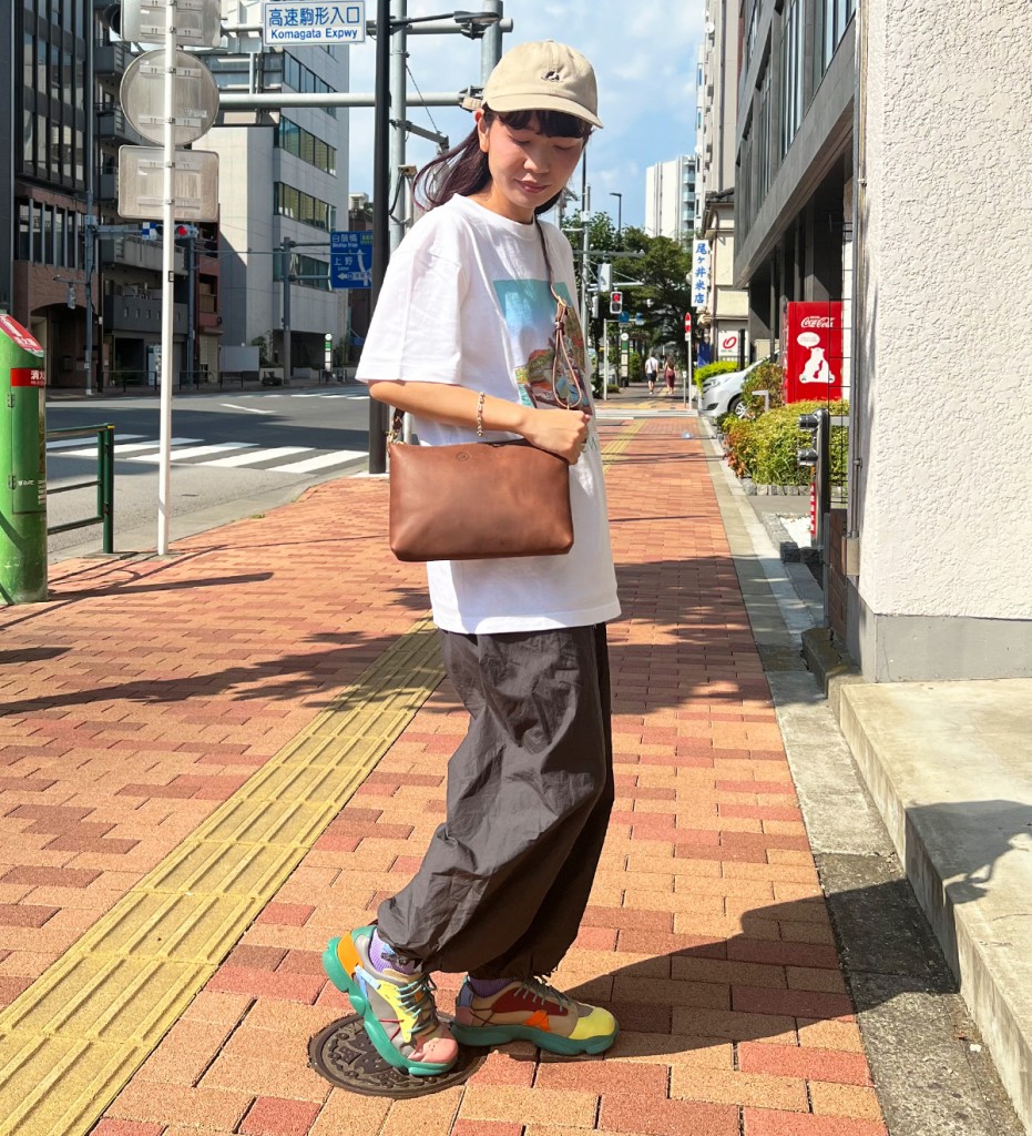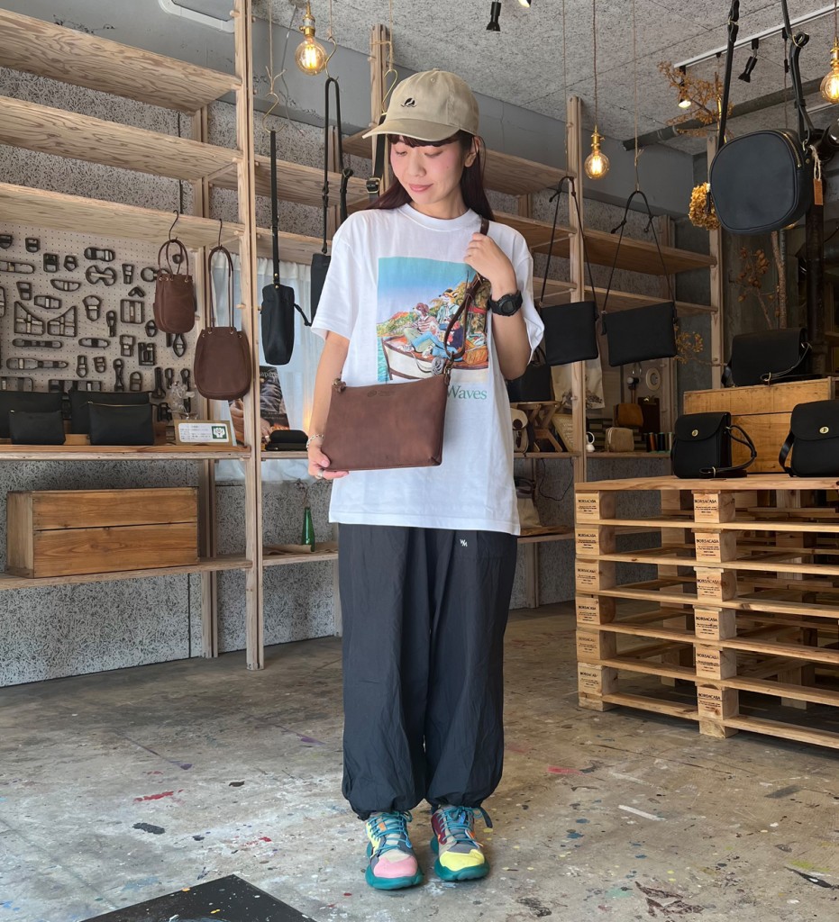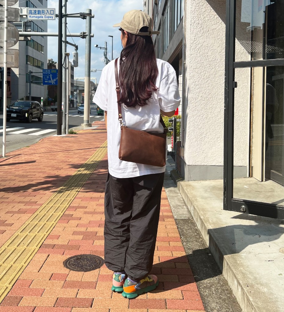さっとお出かけしたい時に持ち歩きたいショルダーバッグ。夏はTシャツと動きやすいボトムスでリラックスしてお出かけしたい日もありますが、そんな日はレザーのバッグを合わせてゆるさにカッチリ感をプラスしてみるのもいいですね。ワイドめな太めなパンツは野暮ったい雰囲気ですが、小物をレザーにするとまた着こなしも変わって見えます。コーディネートの主役のカラフルなスニーカーも鞄で引き締まります!ショルダーもお好みで取り外しが出来るので、いろんなスタイルにも合わせやすい万能タイプ。大活躍間違いなしです。