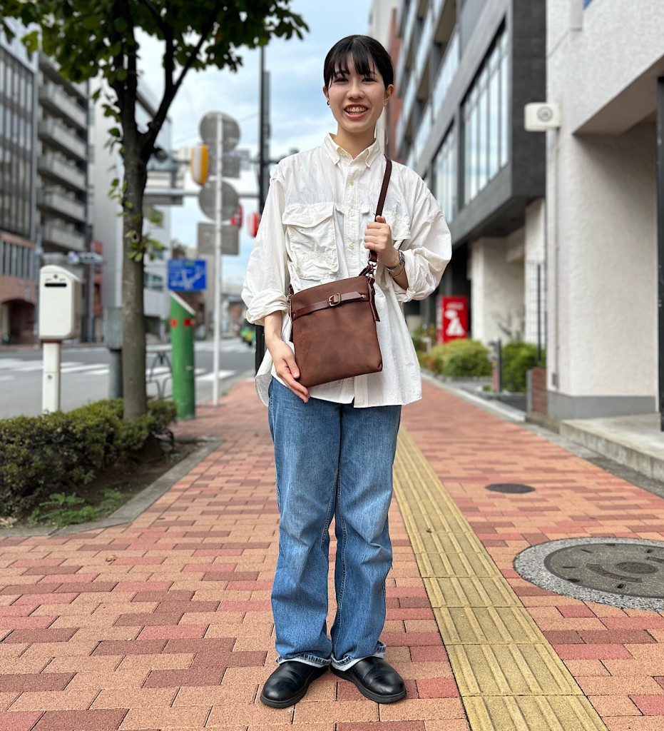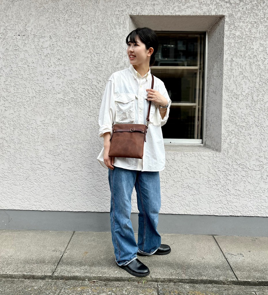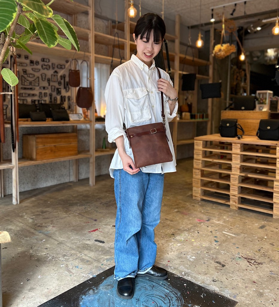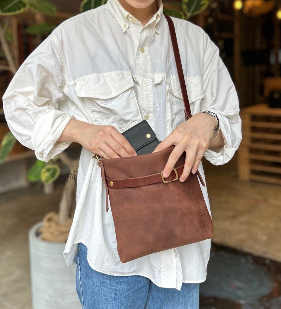 ちょっとそこまでのお出かけも気を抜かない、コーディネートのポイントになるショルダーバッグです。シンプルなサコッシュ形ですが、ショルダー紐のギボシや前面のベルトなど、こだわりの詰まったデザインに仕上げました。財布とスマートフォン、キーケース、必要最低限の荷物を持って、お出かけはもちろんいろんな場所に連れていきたい相棒のようなショルダーバッグです。