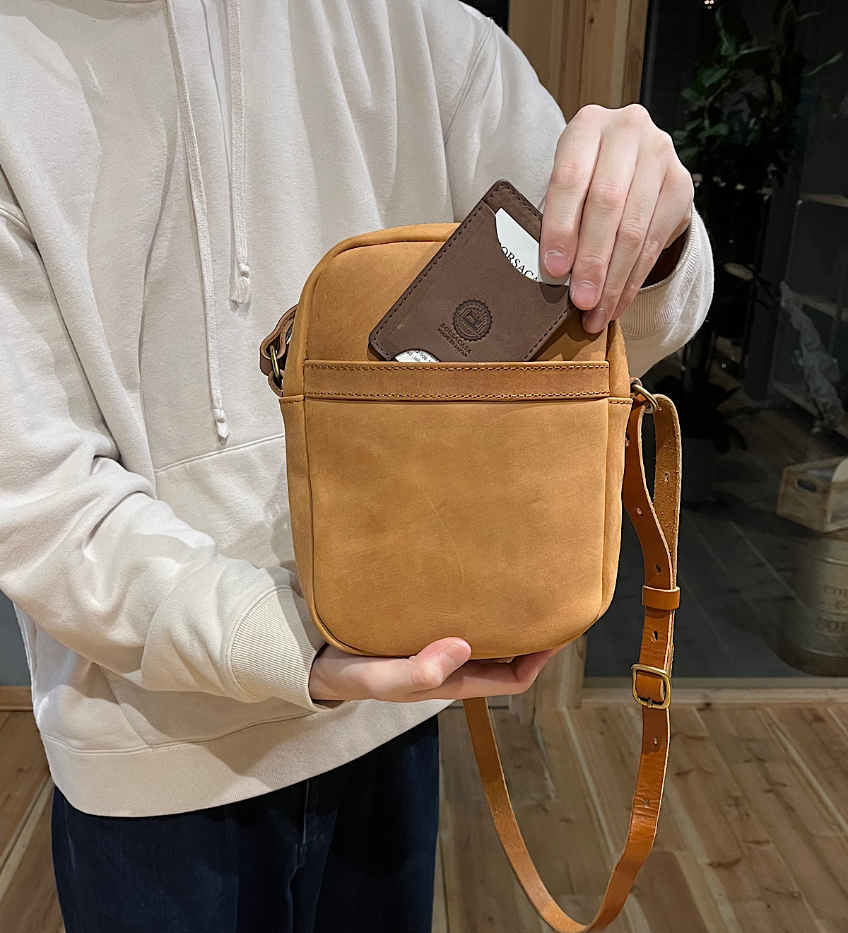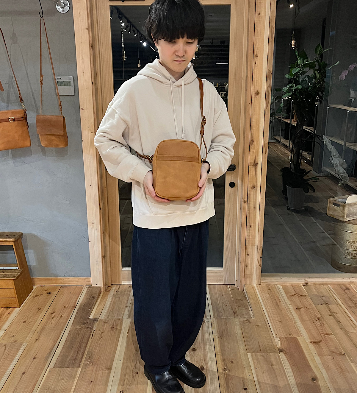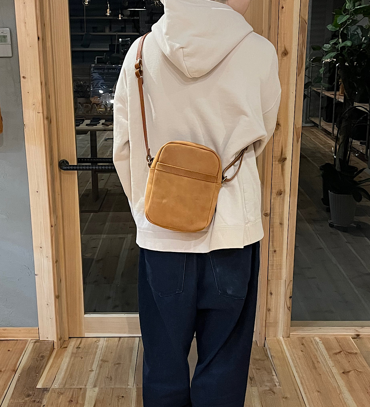 日常使いからお出かけまであらゆるシーンにぴったりなサイズ感のショルダーバッグ。淡い春らしい装いに合うアンバーの色味でコーディネートを組んでみました。バッグのメイン収納には手帳や500mlサイズのペットボトルを。バッグ前面の収納にはスマートフォンやコンパクトなお財布を収納いただくことが出来ます。今回はパスケースを収納してみました!背面部にはロゴを配置。お使いいただく毎にはっきりと浮かび上がってくるのをお楽しみいただけるようになっております◎性差問わずお楽しみいただけるバッグに仕上がりました。