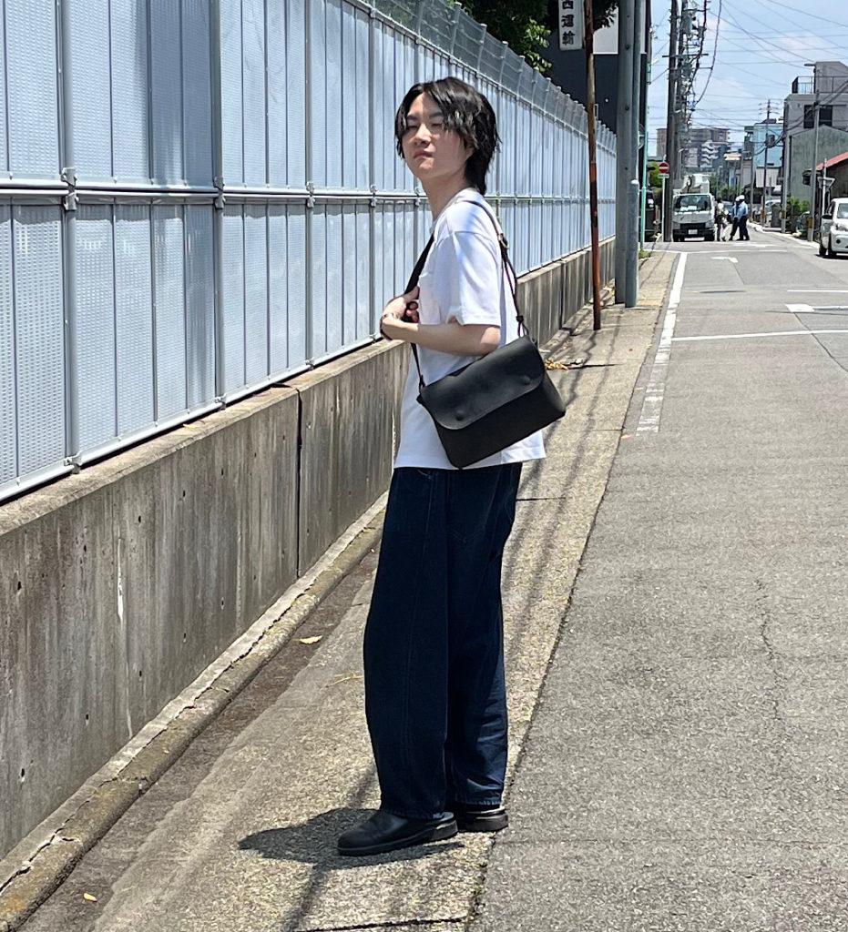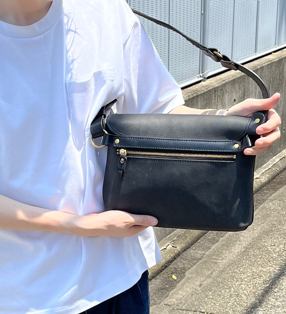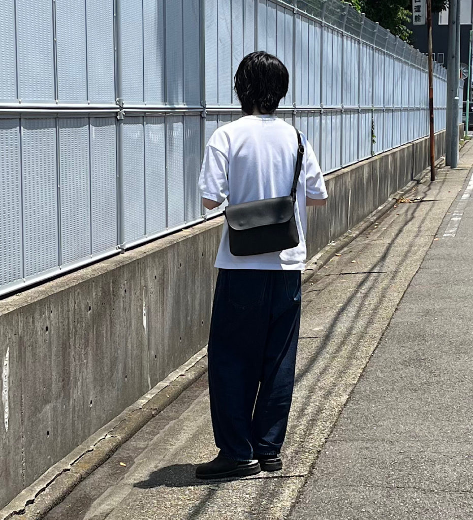 正面のフラップパーツが印象的なショルダーバッグです。シンプルな夏の装いに映えるよう、ブラックの色味でコーディネートを組みました。肩紐の長さを長く設定することでショルダーバッグに。短く設定することでボディバッグに。スタイルに合わせ様々な着用方法をお楽しみいただくことが出来ます。フラップパーツと本体はホックにて固定する仕様に。指を入れて開閉を行いやすい仕様となっております。背面部にはファスナー付きのフリーポケットを配置。アウターのポケット感覚で収納を行うことが出来ます。機能性を持ち合わせたデイリーユースいただけるバッグに仕上がりました。