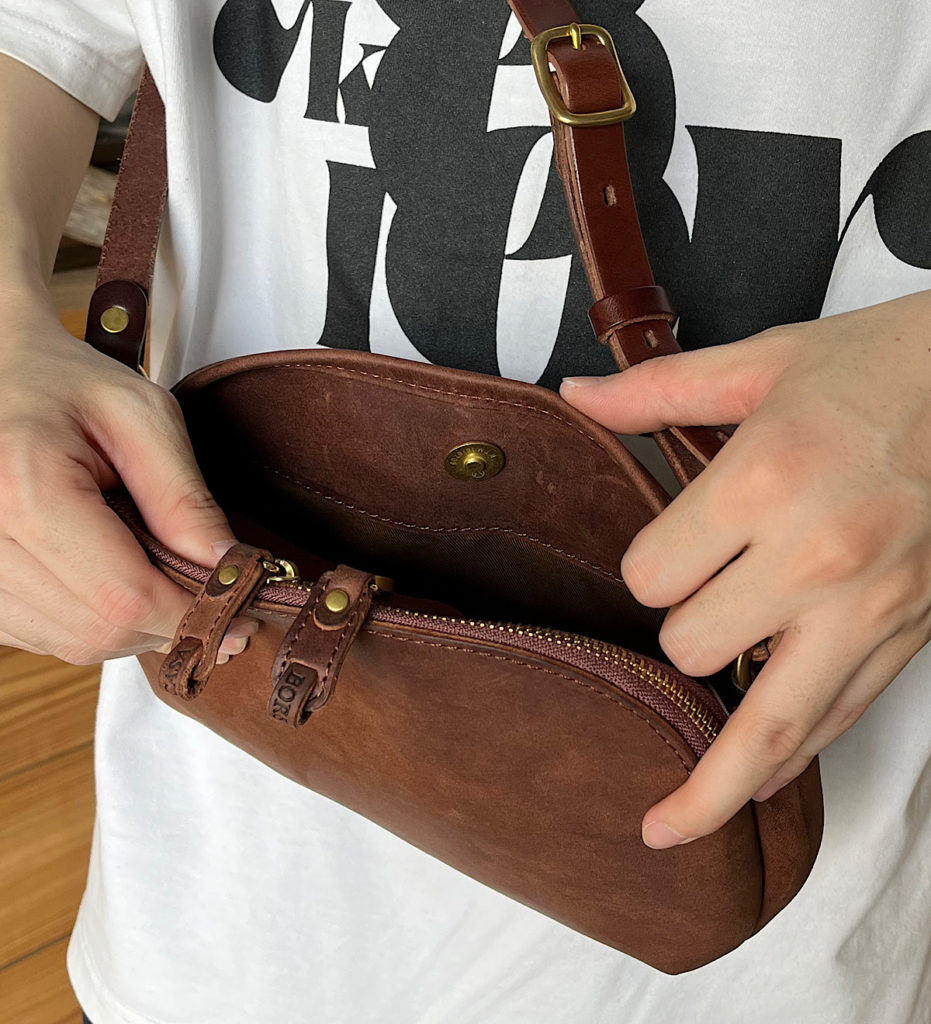 ">https://www.borsacasa.com/products/detail.php?product_id=604 コロンとしたかわいいらしいデザインのショルダーバッグ。夏らしいライトな服装にサコッシュ感覚でブルチャットを合わせてみました。メイン収納にはダブルファスナーを採用しております。引き手パーツを中央にすることでデザイン的ディテールとしてもお楽しみいただくことができます。サブ収納にはマグネットパーツを留め具として採用しております。アウターのポケット感覚でシームレスなアイテムの出し入れを体感していただくことが出来ます。本体背面部にはバッグには珍しく、BORSACASAのロゴを配置。自分だけのこだわりポイントとして光沢や凹凸感の経年変化をお楽しみいただくことが出来ます。小さなフォルムの中にたくさんのこだわりが詰まったバッグに仕上がりました。